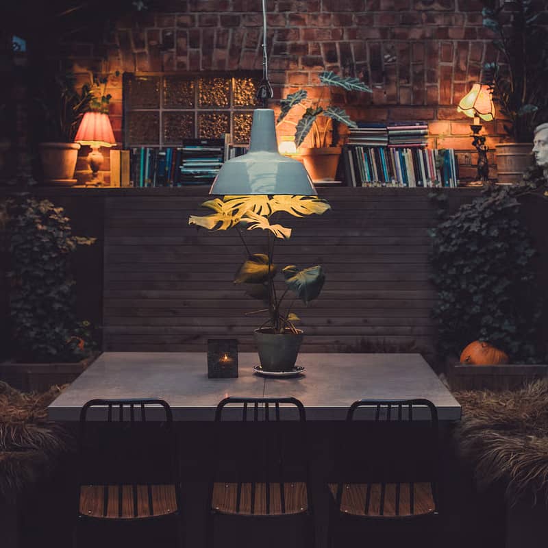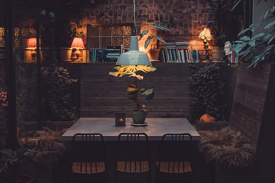 Avslappet stemning med gamle møbler og rustikt preg, og uteservering med grønne planter, langbord og benker.