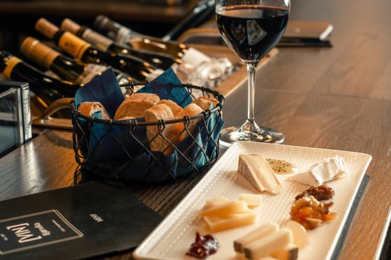Vi har over 100 viner på glass, tusenvis av viner på flaske og enkle matretter som ost og skinke, pate og hummersuppe mm. tilpasset vinene.